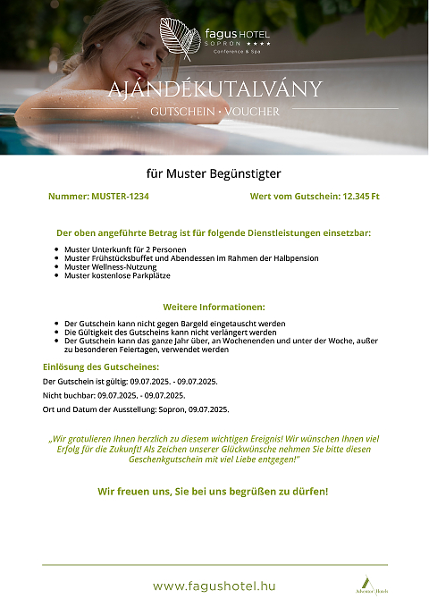 Der Gutschein einlösbar für die Hotelleistungen im Fagus Hotel Conference & Spa**** innerhalb eines Jahres nach Ausstellung des Gutscheins. Der Gutschein ist nicht gegen Bargeld einlösbar und kann nur in einer Summe verwendet werden, da wir den nicht genutzten Wert nicht erstatten können.