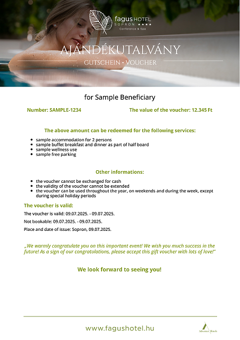 This gift voucher can be redeemed at the facilities of Fagus Hotel Conference & Spa**** within 1 year from the date of issue. The voucher cannot be exchanged for cash and cannot be redeemed in instalments because the unspent amount is non-refundable.